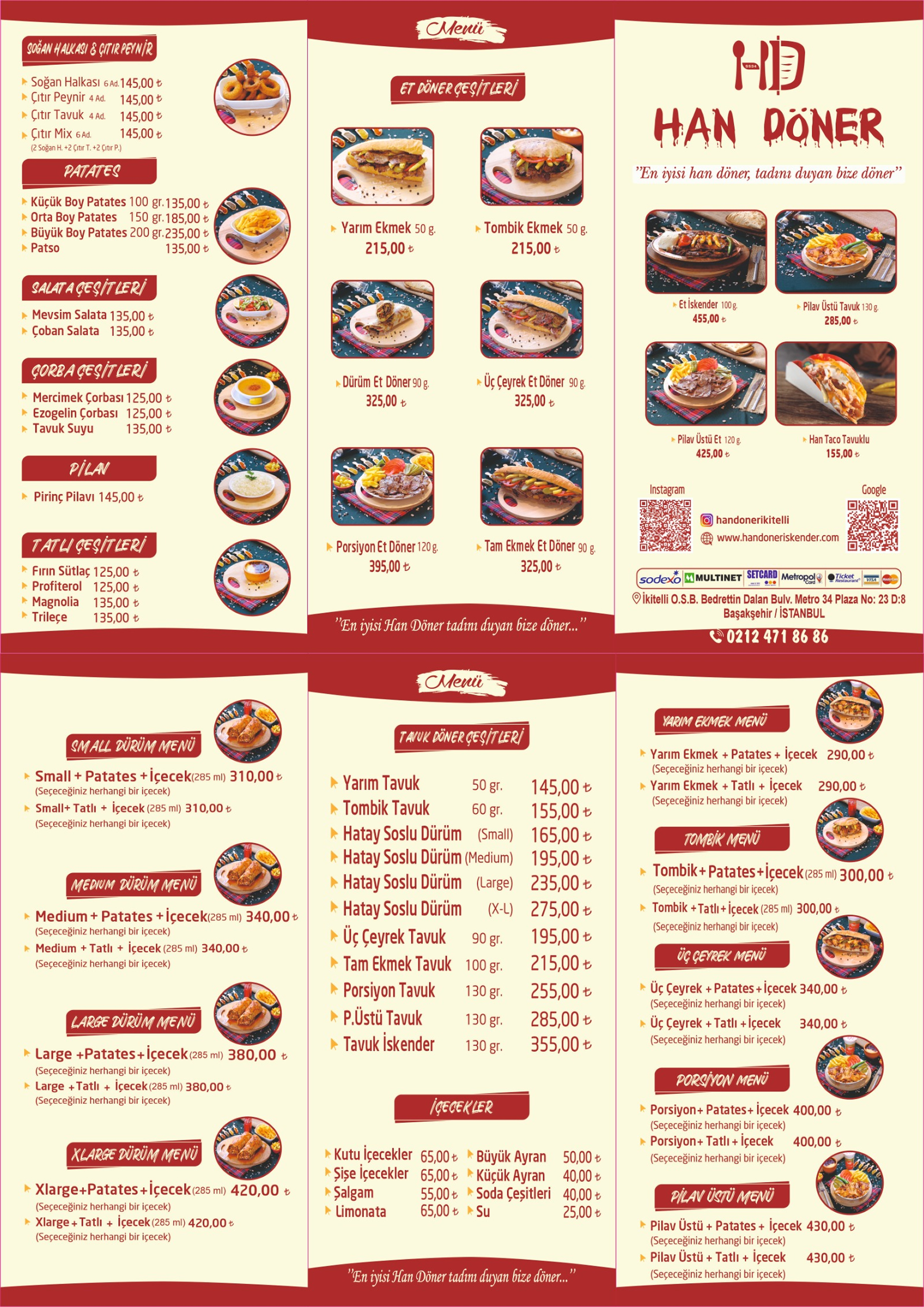 Han Döner olarak müşterilerimize her zaman "Tadı Damağınızda Kalacak" lezzetler sunma amacıyla hız kesmeden çalışıyoruz. Amacımız kalite ve lezzetten ödün vermeden her zaman müşteri memnuniyetini ve beğenisini ön planda tutmaktır. Ayrıca nezih ortamlarda tüm insanların uygun fiyata hizmet alabilmesini sağlamaktır. Her Zaman Uygun Fiyat Her zaman uygun fiyat ve kaliteli ürün sunuyoruz. Hızlı Servis Motokuryelerimiz ile hızlı servis Bol Çeşit Menümüzü sizler için her zaman enginleştiriyoruz.