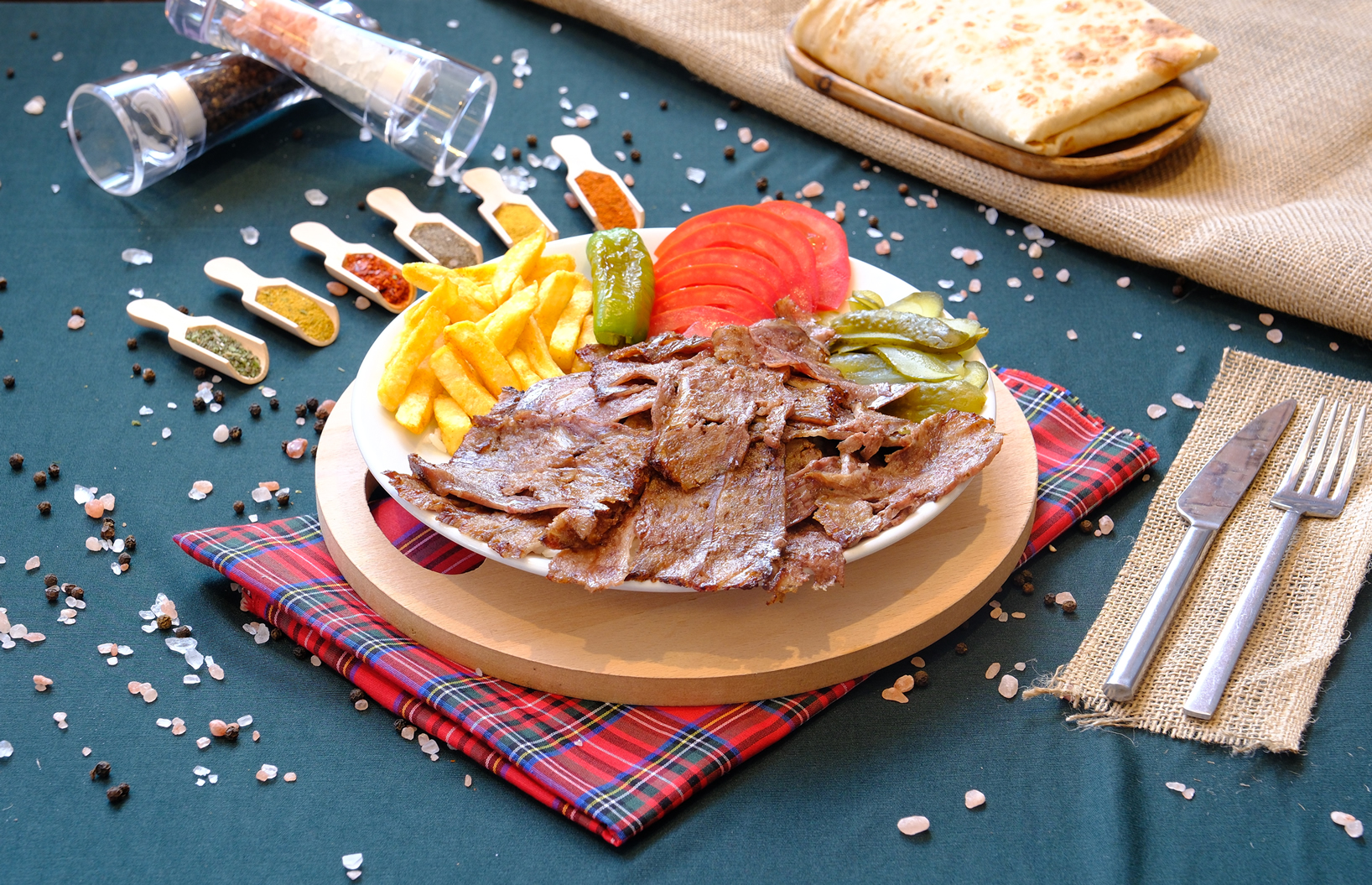 Et döner porsiyon Patates, turşu, domates, isteğe bağlı soğan